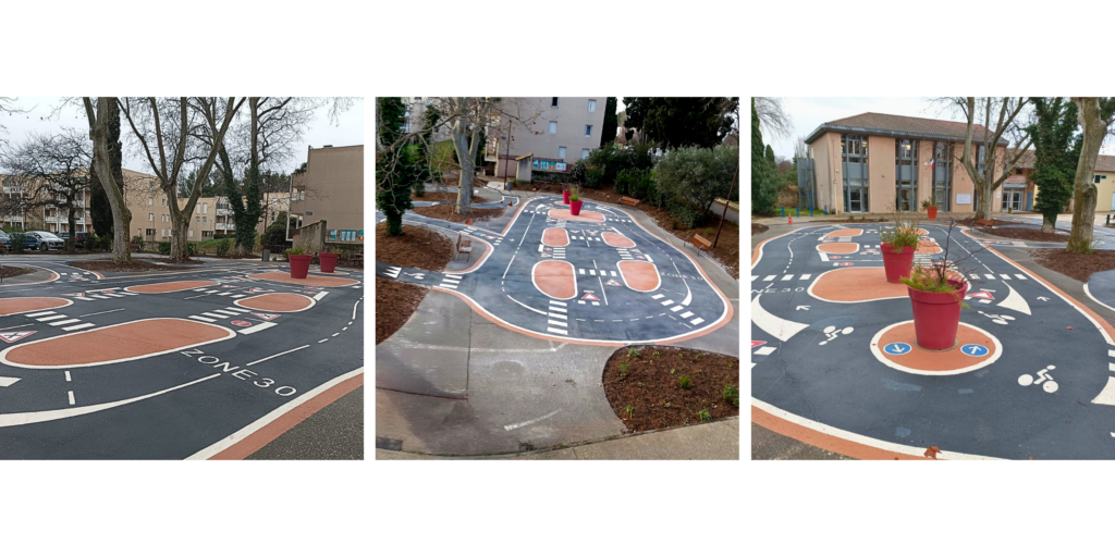 Aménagement urbain | Avignon Nos expertises 🚴♂️ 𝗨𝗻 𝗰𝗵𝗮𝗻𝘁𝗶𝗲𝗿 𝗹𝘂𝗱𝗶𝗾𝘂𝗲 𝗲𝘁 𝗽𝗲́𝗱𝗮𝗴𝗼𝗴𝗶𝗾𝘂𝗲 𝗮̀ 𝗔𝘃𝗶𝗴𝗻𝗼𝗻 ! Notre agence d’Apt a récemment réalisé un 𝗮𝗺𝗲́𝗻𝗮𝗴𝗲𝗺𝗲𝗻𝘁 𝘂𝗻𝗶𝗾𝘂𝗲 𝘀𝘂𝗿 𝗹𝗲 𝗽𝗮𝗿𝘃𝗶𝘀 𝗱𝗲 𝗹𝗮 𝗺𝗮𝗶𝗿𝗶𝗲 𝗘𝘀𝘁 𝗱’𝗔𝘃𝗶𝗴𝗻𝗼𝗻 : une piste éducative pour vélos et piétons, destinée aux enfants. Le revêtement est constitué d’un fond noir en résine. Les marquages sont réalisés en peinture réactive et les logos sont thermocollés, garantissant un rendu à la fois durable et esthétique. L’objectif ? 𝗔𝗹𝗹𝗶𝗲𝗿 𝘀𝗲́𝗰𝘂𝗿𝗶𝘁𝗲́, 𝗽𝗲́𝗱𝗮𝗴𝗼𝗴𝗶𝗲 𝗲𝘁 𝗽𝗹𝗮𝗶𝘀𝗶𝗿 pour les jeunes cyclistes et piétons, tout en apportant une touche professionnelle et durable au mobilier urbain. 👏 Un grand bravo à l’équipe d’Apt pour ce chantier alliant technique et créativité ! Réalisations similaires Réalisations Signalisation Horizontale Aménagement urbain | Avignon Signalisation Horizontale Pumptrack | Grues Aménagement urbainSignalisation HorizontaleSignalisation Verticale Aménagement, signalisation et sécurité | Saint Nazaire